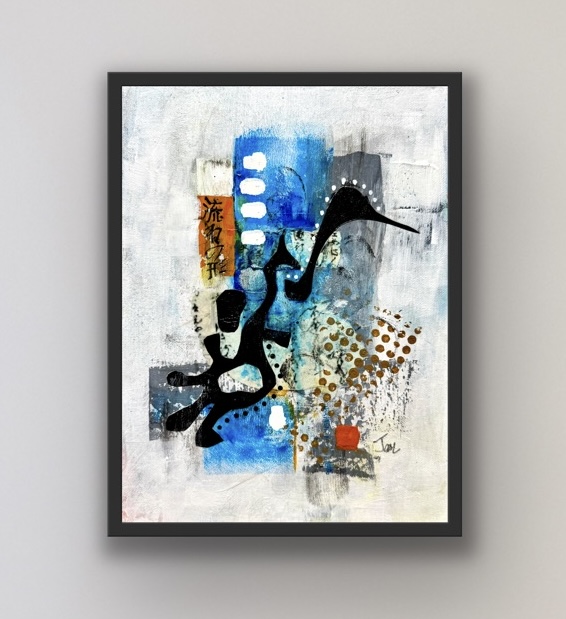 Heron in flight—or maybe still deciding. Motion shaped by current more than control. Original painting, 12×9 mixed media on canvas panel. Price + tax and shipping